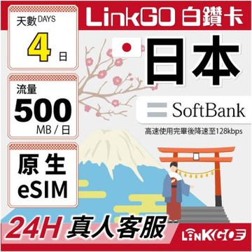 LINKGO白鑽卡 日本 eSIM卡 Softbank 4天上網每日500MB(日本網卡 東京 大阪 福岡 北海道 沖繩)