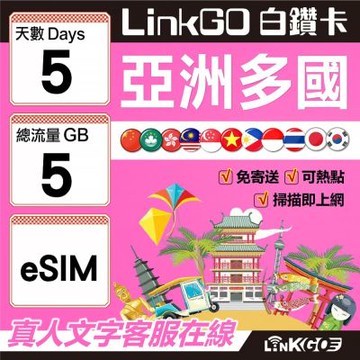 LINKGO白鑽卡 亞洲多國 eSIM卡 5天上網卡 總流量5GB 高速流量(亞洲11國網卡 日韓中澳泰越新馬印柬菲 虛擬卡)