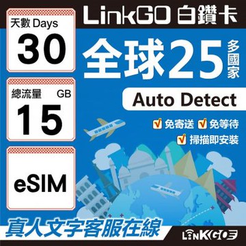 LINKGO白鑽卡 全球25國 eSIM卡 30天上網卡 總流量15GB(全球網卡 亞洲 歐洲 美洲 大洋洲 非洲)