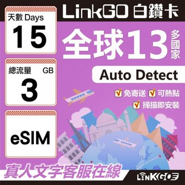 LINKGO白鑽卡 全球13國 eSIM卡 3天上網卡 總流量3GB(全球網卡 亞太區 紐西蘭 澳洲 通行無限)