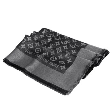 LV Louis Vuitton路易威登 M75123 經典Monogram SHINE 金銀線織花羊毛紡絲大披巾(黑色)