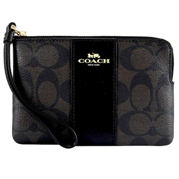 COACH 58035 馬車LOGO條紋皮革零錢手拿包.深咖/黑