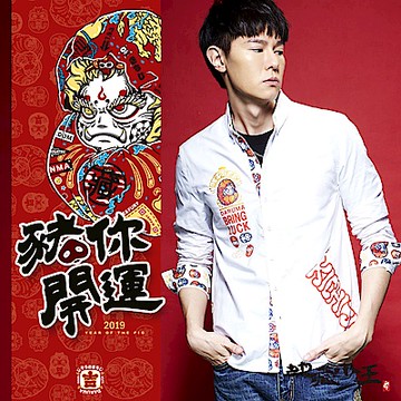不對稱斜開袋,大文字成為白襯衫搶眼的重點,內門襟與多處內裏用花版圖案隱約增加層次感,紅色釦線細細點綴整體配置。
