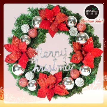 摩達客24吋浪漫朵朵聖誕花豪華綠色聖誕花圈福臨圈(銀紅系)台灣手工藝