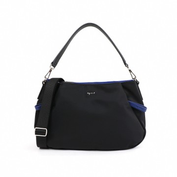 agnes b. 金屬agnes b.前雙側拉鍊尼龍斜背包(黑X寶藍)小款