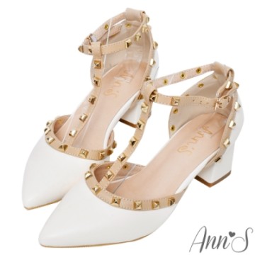 Ann’S修圖效果-顯瘦腳背斜帶沙發後跟粗跟方頭鞋-白
