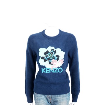 KENZO 刺繡字母扶桑花藍色粗針織100%羊毛衫