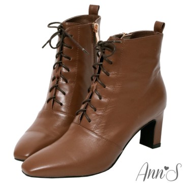 Ann’S頂級小羊皮窄瘦修身造型綁帶方頭扁跟短靴-咖