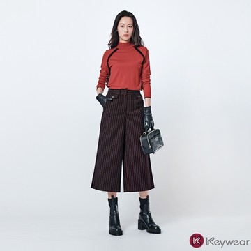 KeyWear奇威名品 俐落色紗直線條紋寬管褲-黑色