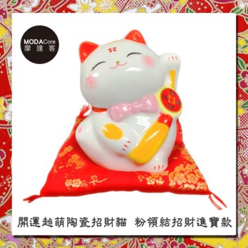 摩達客-農曆新年春節◉開運超萌陶瓷招財貓-粉領結招財進寶款/撲滿存錢桶擺飾桌飾(含坐墊)