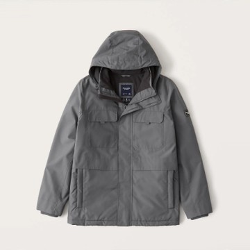 A&F 麋鹿 經典貼標鋪棉防風保暖防潑水連帽風衣外套(男)-淺灰色