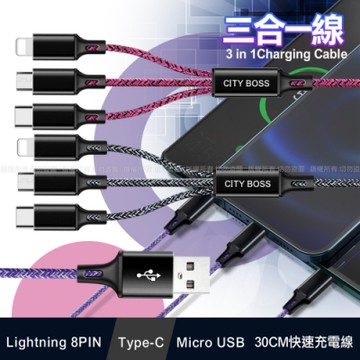 CITY BOSS 3合1快速充電線 30CM /QC3.0/5A iPhone+Type-C+Micro 三合一 編織充電線