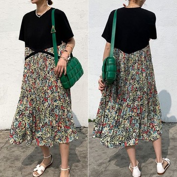 MOCO假兩件圓領黑色交叉高腰拼接印花百摺裙擺連身洋裝XL~5XL
