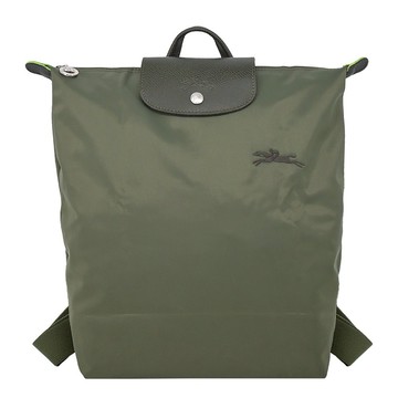 [平輸版]LONGCHAMP LE PLIAGE GREEN系列刺繡再生尼龍摺疊後背包(中/森林綠)真品平輸