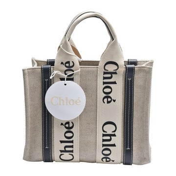 CHLOE- WOODY 系列條槓字母帆布肩背托特包(卡其x墨藍)L