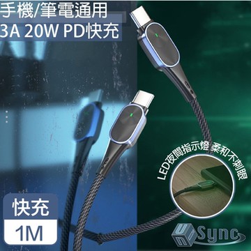 【UniSync】 Type-C夜間指示3A 20W PD快充電傳輸線 銀/1M