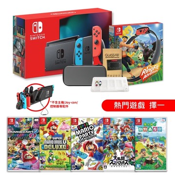Switch紅藍電力加強版主機+健身環+包+貼+充電座+熱門遊戲任選一送卡匣盒