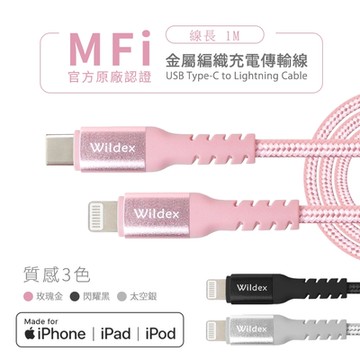 【Wildex】Type-C to Lightning 蘋果認證/金屬編織PD快充線/充電傳輸線(1M)