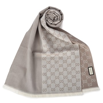 GUCCI 經典雙G緹花雙色拼接純羊毛長圍巾-奶茶色