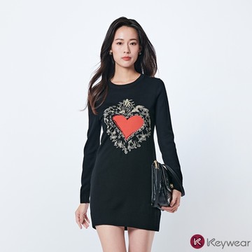 KeyWear奇威名品 經典愛心緹花長版長袖毛衣-黑色