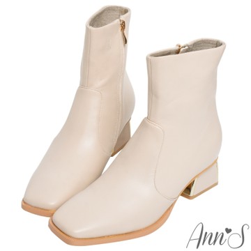 Ann’S純色羊皮真皮電鍍夾心粗跟方頭短靴5cm-米白