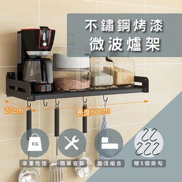 百轉空間 (贈免釘膠/小掛鉤)質感烤黑不鏽鋼60*27CM單層免釘置物架 (1入)