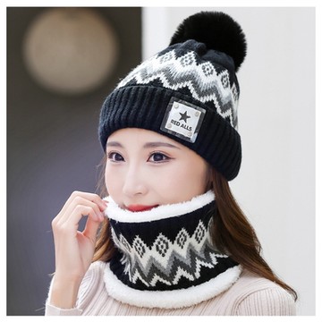對抗霸王寒流暖呼呼組合 大毛球毛線緹花毛帽脖圍二件組