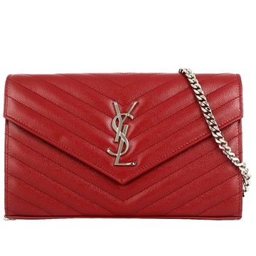 YSL MONOGRAM 紅色V型縫線珍珠紋皮金鍊手拿/斜背包(10卡)