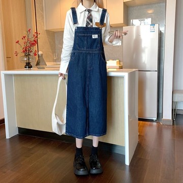 牛仔連衣裙女春秋季小個子寬松休閑氣質深藍色吊帶長裙外穿背帶裙