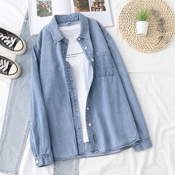 北歐精致 小眾天絲超柔水洗牛仔襯衫女正肩百搭顯瘦長袖襯衣春夏