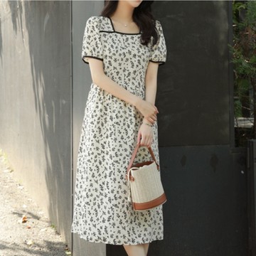 韓國chic夏季粉嫩減齡圓領撞色花色印花泡泡袖大擺型連衣裙長裙女