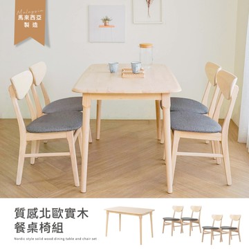 【H&D東稻家居】質感北歐實木餐桌椅組(灰色坐墊)/一桌四椅120*75公分餐桌椅組