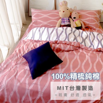 單人3尺床包組(含枕套) 100%精梳棉【律動曲線 粉紅】40支純棉 大鐘印染 台灣製造