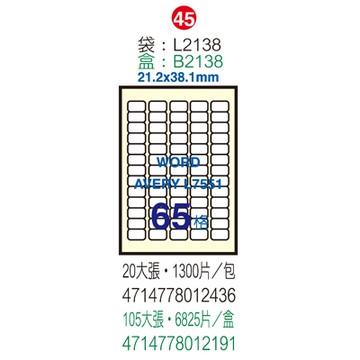 鶴屋 A4三用電腦標籤 45號 B2138 38.1 x 21.2mm 105張 65格