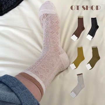 OT SHOP女款襪子 微透膚網眼中筒襪 棉質 花邊襪口 鏤空菱格紋 現貨 M1206
