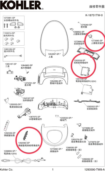 【麗室衛浴】美國 KOHLER C3-050 K-18751T-0 電腦馬桶蓋專用零件目錄