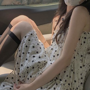 2022年一字肩碎花吊帶娃娃裙子春無袖a字冷淡風鎖骨甜美連衣裙女