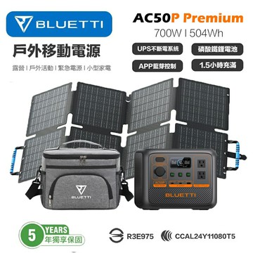 BSMI 證號: R3E975 NCC : CCAL24Y11080T5 【特色】 ★ 700W額定功率/1,200W瞬間功率 ★ 600W 快速充電,50 分鐘充至 80% ★ 透過 BLUETTI 應用程式進行智慧遠端控制 ★ 6 個多功能端口+ 無線充電盤15W,滿足您的所有需求 ★ 安全的磷酸鋰電池和電池可充電 3,000 多次 ★ 20 毫秒內不斷電 UPS ★ 享有業界領先的 5 年保固 高效、輕巧、強大 BLUETTI AC50P 電站是您可以在露營團體中炫耀的東西。它具有 504Wh 容量和 700W 高功率輸出,確保您擁有充足的能量來運行必需品。先進的AI-BMS智慧優化能耗,最大限度地延長運行時間和提高效率。可靈活地透過太陽能板或電池組充電,您可以不間斷地享受持續的電力。 AC50P 重量輕且便於攜帶,是您戶外探險甚至緊急情況下的首選電源。 三重技術延長電池壽命 BLUETOPUS BMS:這款由人工智慧驅動的電池管理系統可優化能源利用率,確保您整個旅程的電力供應持續穩定。 日間太陽能:白天使用太陽能板充電,讓您為設備供電,同時補充電池電量。 精緻設計,卓越性能 AC50P 擁有業界領先的 700W 額定功率,比同類產品高出 200W,可輕鬆為更多設備供電。啟動功率提升模式*,可驅動高達 1,200W 的設備,例如水壺、電飯煲等。 *非常適合運行 1,200W 以下的純電阻負載。 您的安全,我們的首要任務 AC50P 使用更安全的 LiFePO4 電池,使用壽命長達 10 年。它可以在 -20°C 至 40°C 的溫度範圍內平穩運行,具有抗過熱能力,並且可以在極冷條件下安全使用。 靈活選擇您喜歡的任何充電方式 同時為多達 6 台設備供電 AC50P 不僅僅是一個發電站;它是您的個人能源中心。它配備一系列插座,包括 2 個 700W 交流電源插座、2 個 65W USB-C 端口、1 個 15W USB-A 端口和 1 個 120W 點煙器端口,確保您的離網生活不會錯過任何節拍。 睡眠級噪音,安睡一夜 讓自己沉浸在大自然中,不受惱人噪音的干擾。 AC50P 運作時噪音水平極低,僅 45dB – 與現代冰箱一樣安靜。現在,您可以不受干擾地聆聽大自然的舒緩聲音,或在帳篷裡安然入睡,而不會受到嗡嗡聲的干擾。 智慧電力,智能生活 透過直覺的 BLUETTI 應用程序,您可以掌控 AC50P 的一切。無論您是在家中還是在野外,您都可以監控即時電源使用情況和電池電量,自訂充電設定以獲得最佳效能,甚至更新韌體以獲得增強功能。 【商品規格】 容量:504Wh AC+DC輸入:最大600W 充電溫度:0'C - 40度C 放電溫度:-20度C-40度C 輸入功率:最大600W (50分鐘可充電至80%) 交流輪出功率:700W 浪湧輸出功率:1200W 點器端口:12VDC/10A,最大輸出120W USB-A*1:5VDC/3A 15W USB-C*2:PD最大100W 無線充電盤:15W 壽命:3500次以上(80%+) 太陽能板充電: 功率 :12V-58Vdc 200W Max 汽車充電:12V-24Vdc 輸入電源來源 :AC 充電器、汽車充電、太陽能板蓄電 電池類型 :LiFePO4磷酸鐵鋰離子 逆變器類型: 純正弦波 50hz / 60hz 控制器類型 MPPT 充電類型:Type C、手電筒、點菸器直流充電 電池類型:鋰鐵磷酸鋰(LiFePO4,LFP) DC 輸入功率:200W/8.5A 最大功率/最大電流 APP功能 :智能操控 UPS功能:切換時間小於20ms 內置太陽能控制器 MPPT 設備尺寸: 28cm x 20cm x 22cm 重量:6.9KG 【商品內容】 ◆ BLUETTI AC50P 行動電站 x1 ◆ AC電源線 x1 ◆ 車載點菸充電線(Car to XT60-F) x1 ◆ 太陽能板充電線(MC4 to XT60-F) x1 ◆ 說明書 x1 ◆ 產品保固卡 x1 【商品保固】 購買時請指名台灣公司貨:禾蓁發展企業有限公司 才享有保固5年 BLUETTI 60W 便攜式太陽能板可提供 60W 太陽能,實現高效的太陽能吸收, 相容於 BLUETTI Handsfree 1、Handsfree 2、AC2A 以及 USB-A、USB-C 電子設備。 這款太陽能板採用單晶電池,可將高達 24.7% 的陽光轉換為可用電能,確保您即使在陰天也能保持充電狀態。 採用持久的 ETFE 塗層,可防止刮擦和濺水(IP65 等級),非常適合露營、釣魚、遠足等。 重量僅 1.4 公斤,折疊後尺寸為 23x21x7cm ,易於打包並隨身攜帶,可立即利用太陽能供電。 【商品規格】 功率:60瓦 塗層:ETFE(乙烯四氟乙烯共聚物) 類型:單晶矽 電池效率:高達 24.7% 最大功率電壓(Vmp): 23.1V 最大功率時的電流(Imp):2.58A 開路電壓(OCV):27.5V 短路電流(Isc):2.76A 連接器:標準 MC4 連接器 折數: 8 折 重量:1.4公斤 尺寸(折疊): 226*210*70mm 尺寸(展開): 900*424 mm 工作溫度:: -10-65℃ 最佳工作溫度:25 攝氏度 【商品內容】 BLUETTI 60W太陽能板、DC5521轉XT60連接器(1.2m)、登山扣×2 【保固】 台灣禾蓁公司貨 非人為一年保固