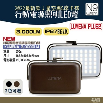 產品名稱 N9 LUMENA PLUS2 行動電源照明LED燈 顏色款式 摩卡棕、星空黑 IP防水防塵等級 IP67 尺寸/重量 168.6 x 103.4 x 29 mm / 550g 亮度(流明) 100 ~ 3,000Lm LED色溫(變換) 3,000K(黃光)/4,500K(自然光/6,500K(白光) 電池類型/容量 Li-Polymer 20,000mAh (74Wh) 使用時數 最大亮度10小時~最小亮度120小時 充電時間 約5小時30分鐘(QC充電器) 充電器安培(A)大小會影響充電時間 INPUT(Type C)5V-3A / 9V-2A/ 12V-1.5A(MAX 18W) OUTPUT 1 (Type C)5V-3A/ 9V-2.22A / 12V-1.67A(MAX 20W) OUTPUT 2 (USB A)5V-3A /9V-2A / 12V-1.5A 內容物本體.保護盒.TYPE-CUSB充電線旋轉掛勾、D型扣保證卡 A/S保固1年(非人為因素) 本產品已投保富邦產品責任險3200萬 BSMI:R55109 ---------------------------------------------------- 本店成立於1979年,是在高雄經營三十年以上的老店 販售的商品均為正規公司貨,請放心使用 實體店面與網路購物同步販售 讓您不用擔心售後服務 野外營戶外旅遊用品店 ??地址高雄市三民區民族一路186-1號 ??客服專線 07-3822383 ??客服服務時間 週一至週六 11:00~21:00 ※每台顯示器皆有色差,圖片僅供參考,請以實際商品為主
