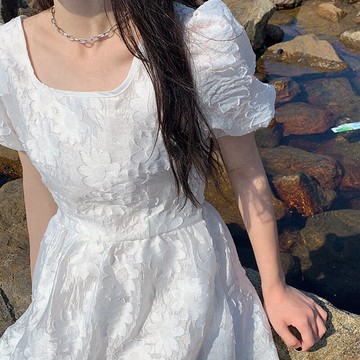 法式桔梗初戀甜美約會小裙子夏季仙女超仙一字肩泡泡袖蕾絲連衣裙