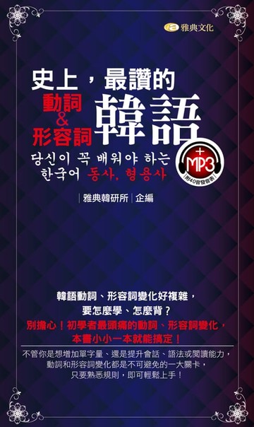 作者:雅典韓研所 出版社:雅典文化 出版日期:2013/04/12 語言:中文 ISBN:7333866282799 檔案格式:EPUB3-固式格式 閱讀裝置:閱讀器, Android應用程式, iOS應用程式 韓語動詞、形容詞變化好複雜,要怎麼學、怎麼背?別擔心!初學者最頭痛的動詞、形容詞變化,本書小小一本就能搞定!不管你是想增加單字量、還是提升會話、語法或閱讀能力,動詞和形容詞變化都是不可避免的一大關卡,只要熟悉規則,即可輕鬆上手!.基本詞彙參照韓語檢定(TOPIK)初級程度,整理出初學者一定要會的基礎動詞和形容詞。.舉一反三補充與該詞彙相關的反義詞、同義詞、類義詞、慣用語以及相關詞等,快速增加韓語單字量。.詳細歸納為初學者詳細歸納出動詞、形容詞的十大變化方式,讓讀者可以輕鬆理解。.生活會話提供使用該詞彙的情境生活會話,為韓語學習增添樂趣。.實用例句補充相關例句,讓讀者更熟悉該詞彙的使用方式。.快速查詢比照韓語字典編排,讓讀者查詢更方便!.輕巧方便小小一本,放入口袋中,走到哪裡單字就背到哪裡!!