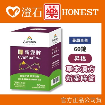 商品特色 藻紅素(蝦紅素) 是葉黃素的超級昇級版! 枸杞子萃取物(玉米黃質素),麥門冬萃取物,山桑子萃取物(花青素),草決明萃取物,維生素C,紅球藻萃取物(藻紅素),維生素E,葡萄糖酸鋅,維生素A,硒酵母,維生素B2,維生素B6,維生素B1 晶亮有神 黃金比例調配 全方位呵護 純素食品 品名 新愛眸錠 EyeMax Neo 成分 枸杞子萃取物(枸杞萃取物、麥芽糊精),麥門冬萃取物,山桑子萃取物,草決明萃取物,麥芽糊精,維生素C,玉米澱粉,羥丙基纖維素,紅球藻萃取物,二氧化矽,硬脂酸,維生素E(乙酸dl-α生育醇酯、麥芽糊精、辛烯基丁二酸鈉澱粉、二氧化矽),羥丙基甲基纖維素,硬脂酸鎂,葡萄糖酸鋅,維生素A醋酸鹽(麥芽糊精、阿拉伯膠、玉米澱粉、維生素A醋酸鹽、dl-α生育醇(抗氧化劑)),硒酵母,丙二醇,維生素B2,維生素B6,維生素B1 食用方法 於餐後搭配開水食用(一日請勿超過2錠,多食無益 )【初期】每日2錠,於早、晚餐時併餐各食用1錠 【維持】每日1錠,於早餐時併餐食用1錠 【甜食、油膩食物不宜者】於早、晚餐時併餐各食用1錠 【產品說明】消費者使用前應詳閱產品說明書 【注意事項】消費者使用前應詳閱醫療器材產品說明書 【藥商許可執照】 中市醫材販 字第 MD6203042791號 醫療器材商名稱:澄石生技有限公司 醫材商諮詢電話:04-22515368 藥局名稱:澄石藥局 藥局諮詢電話:04-22511883 藥局地址:台中市南屯區公益路二段603號1樓 ??歡迎光臨✚澄石藥局?? ✔ 100%台灣賣家,台中實體店面經營 ✔ 賣場皆為全新公司貨,安心購買不擔心 ✔ 發票採用"電子發票",如需統編請先填寫 ??購物須知 • 賣場商品圖片僅供參考,因電腦螢幕與手機螢幕皆會有色差,以收到實際商品為主 • 收到包裹請先開箱並錄影,若收到商品有損壞或與實際不符合,請至「聊聊」訊息客服,會有專人為您處理 • 個人衛生用品若經拆封恕無法申請退換貨(含貼身內衣褲、口罩、紙尿褲、奶嘴、奶瓶) • 賣場商品皆為現貨,下單後即會安排出貨,恕不接受聊聊更改訂單 • 申請退換貨商品必須保持全新未拆封,若經拆封恕不接受退換貨