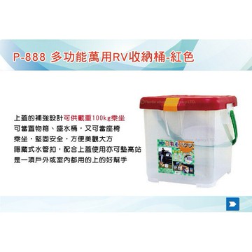 上蓋的補強設計可供載重100kg乘坐 可當置物箱、盛水桶,又可當座椅 乘坐,堅固安全,方便美觀大方 隱藏式水管扣,配合上蓋使用亦可墊高站 是一項戶外或室內都用的上的好幫手 品名:多功能萬用RV收納桶 型號:P-888 顏色:三色可選 使用尺寸:32 x 30 x 30(h)cm 材料:聚丙烯(PP) #RV桶 #洗車桶 #月光寶盒