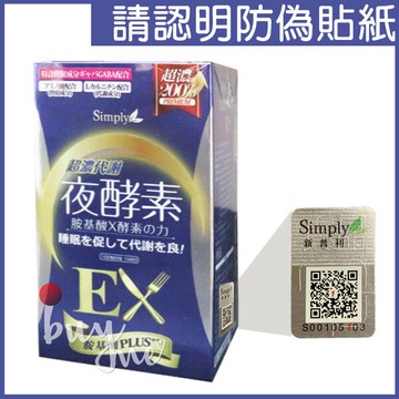 商品名稱 Simply 超濃代謝夜酵素錠EX(升級版) 規 格 30錠/盒 產品說明 成份: 綜合必須胺基酸、啤酒酵母、專利麩胺酸發酵物粉、脂肪分解酵素、鳳梨酵素、碳酸鈣、麥芽糊精、澱粉分解酵素、專利益生菌、L肉鹼、巴西酵素、專利綜合蔬果酵素等詳見包裝 食用方式:每日睡前食用2錠,配合溫開水服用 備 註 1.孕婦、服用藥物或有其他疾病者,請先徵詢醫(藥)師意見再行食用。 2.開封後為維持產品新鮮度,請儘速食用完畢。 3.不建議嬰幼兒、兒童、孕婦與真菌過敏者使用。 4.本產品含牛奶及其製品、大豆及其製品、芒果、奇異果,不適合對其過敏體質者食用。 5.三歲以下孩童不得使用,請置於無法取得處。 好康訊息