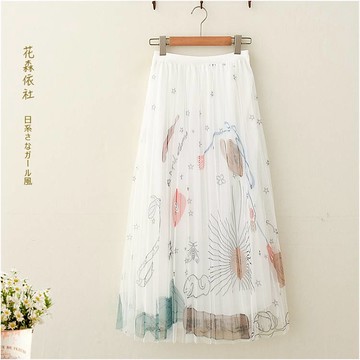 日系森女春夏裝童趣印花網紗裙半身裙學生少女仙女網紗裙中長裙子