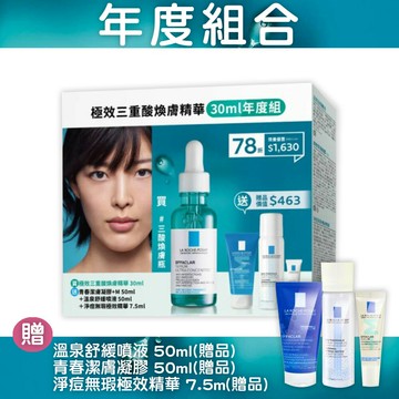 商品內容: 理膚寶水極效三重酸煥膚精華(三酸煥膚瓶) 30ml 理膚寶水淨痘無瑕極效精華 7.5m(贈品) 理膚寶水溫泉舒緩噴液 50ml(贈品) 理膚寶水青春潔膚凝膠 50ml(贈品) 產品功效: 三重酸有感煥膚,粉刺-50%,緊緻毛孔,淡化瑕疵 • 首創獨家三重酸配方(超越基礎煥膚,深度代謝粉刺) 改善各種頑固粉、緊緻毛孔、淡化瑕疵 1.甘醇酸:代謝表層老廢角質,均勻膚色,淡化瑕疵 2.水楊酸:代謝老廢角質,緊緻毛孔,持續改善粉刺瑕疵 3.專利LHA:萊雅專利成份,加速代謝深層粉刺,預防生成 • 添加有效舒緩成分,溫和煥膚低刺激 1.菸鹼醯胺:舒緩泛紅不適,修復肌膚 2.理膚寶水溫泉水:含微量元素保濕,舒緩敏感不適 • *臨床證實:有效減少粉刺50%,緊緻毛孔12%,淡化瑕疵49% • 精華質地,水潤保濕,推開後迅速吸收不黏膩 • 使用對象:油性肌、粉刺肌、粉刺痘痘混和肌 • 使用時機: 1.每日晚上清潔於化妝水後使用,取適量產品於掌心均勻塗抹於臉部,待肌膚吸收後,再搭配乳液使用。請避開眼周肌膚、唇部。 2.若於早晨使用,建議於日曬前擦上SPF30以上係數的防曬,以達最佳產品使用結果。