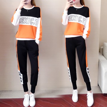 春秋2021新款韓版大碼拼接網紅時尚休閑套裝女長袖跑步運動兩件套