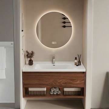 浴室柜衛生間實木胡桃木洗手盆陶瓷一體浴室柜組合酒店風浴室柜 y8051