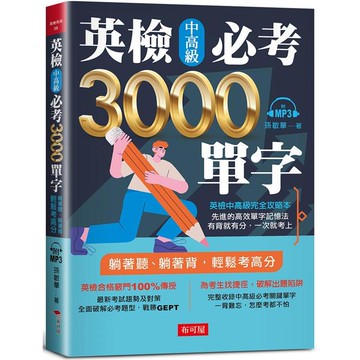 作者:孫敏華 出版社:布可屋 出版日:1110112 ISBN:9789865544713 語言:中文繁體 裝訂方式:平裝 內容簡介 英檢中高級直達車 實力UP! UP! 中高級必考3000單字速記法 完全掌握出題範圍及考試方向 躺著聽、躺著背,輕鬆考高分! ◆中高級完全攻略本 8種超高效率單字記憶法 讓您快速記住中高級必考3000單字 ◆常考、必考單字,速記攻略本 有背就有分,一次就考上 本書分三階段攻堅, 讓您快速攻上中高級殿堂! 【最強英檢單字工具書】 1.英檢合格竅門100%傳授 精選命題率最高的單字 全面破解必考題型,戰勝GEPT 2.全民英檢完全攻略本 最新考試趨勢及對策 一背難忘,怎麼考都不怕 3.為考生找捷徑,破解出題陷阱 完整收錄中高級必考關鍵單字 有背就有分,增加應考能力 【8種超高效率單字記憶法】 ◆背單字,就要像滾雪球,詞彙越滾越多 根據作者長期的著作及翻譯經驗從單字的發音、字形、構造、詞義,和用法等幾個方面,總結了記憶單字的各種竅門,目的在幫助讀者在記憶和學習單字時最大限度地少走彎路,節約時間和精力,它還能啟發讀者自己歸納出適合自身特點的記憶技巧。 衝刺、考前10分鐘臨場用,英檢中級一定都合格! ◆完全掌握出題範圍及考試方向: 1.提供最佳的快速取分攻略 根據心理學原理,創立符合華人記憶習慣的最新、最有高效單字記憶法,從歸納英語單字的特點,到變形記憶法、母子關係記憶法、比較記憶法…,像滾雪球,舉一反三,事半功倍,一次就考上。 2.歷年來考試頻率最高的單字 電腦嚴選英檢中高級測驗中,出現頻率最高的單字,教您如何在短期內準備好考試。為了有效率地提升中高級應試者,英語單字的理解力、運用力以及綜合能力編輯而成。 3.常考必考單字,全收錄 全部命中!隨身一本,隨時看,保證關關考試,關關過! 完整收錄全民英檢中高級最常考、必考關鍵單字,考前7天衝刺、考前10分鐘臨場用,英檢中高級一定都合格! 【英語檢定高分技巧】 1.單字記得愈多,勝算愈大 世界上應該沒有一套完美的法則,去衡量一個人的英文到底好不好,現今的各種英文檢定考題方向都不同,也許有人在考試成績不盡理想時,就開始埋怨考題出得不好,或是試題方向太偏,但是學習英文時有一個放諸四海皆準的原則,那就是多背單字,單字記得愈多,勝算愈大。 2.背單字是要有技巧 想必大家也都很清楚「多背單字」的好處,但是英文單字的量,卻似乎怎麼也消化不完,先不說剩下沒背完的部分, 說不定前5分鐘剛記的單字又忘記了,單字似乎長腳似的,就是不願意在腦中生根。 由此可知,背單字是要有技巧的,光靠死背並不是長久之計,只要掌握了英語的規律,和正確的學習方法,不但能將單字在第一次時就牢牢地記住,同時也節省許多不必要的時間浪費,讓背單字不再是件難事。 3. 最新、最有效的單字記憶法 本書給學英文的學習者,提供了一些有效記單字的方法,其中根據最新、最有效的單字記憶術,依照心理學原理和華人記中文字的記憶習慣,類推於英語單字來,創立符合華人記憶習慣的高效記憶法。 本書特色 1. 耳目一新的記憶法 從歸納英語單字的特點,總結出叫人耳目一新的發音記憶法、聯想記憶法、母子關係記憶法、變形記憶法、比較記憶法、字根記憶法、詞綴記憶法、歸納記憶法、趣味記憶法&hellip... 目錄 ◆前言 ---英檢中高級必考3000單字速記法 ◆最新、最有效單字速記法 ---背單字,就要像滾雪球,越滾越多 ●1.聯想記憶法、 ●2.母子關係記憶法、 ●3.變形記憶法(一) ●4.變形記憶法(二) ●5.比較記憶法(一) ●6.比較記憶法(二) ●7.字根記憶法 ●8.詞綴記憶法、 ●9.歸納記憶法、 ●10.趣味記憶法 ◆英檢必考3000單字 ◆第一階段A : abortion ~ authorize B : babe ~ buzz C : calculator ~ cyclist D : dart ~ dwelling E : earnestly ~ extract F : fable ~ fuzzy G : gallon ~ gunman H : habitual ~ hymn I : idealize ~ isolation J : jerk ~ justification K : kit L : lacking ~ lumber M : magnetic ~ mutton N : narration ~ nutrition O : oat ~ ownership P : pant ~ purity Q : qualification ~ quietness R : rack ~ rust S : salaried ~ systematic T : tablet ~ tuna U : ultimately ~ utmost V : vacant ~ vowel W : walnut ~ wrongly ◆第二階段A : abandonment ~ axis B : bachelor ~ bypass C : calamity ~ cylinder D : dazzle ~ dutiful E : eastward ~ eyesight F : fabric ~ fury G : gardening ~ gunshot H : hairy ~ hypothesis I : idealistic ~ itch J : jeweler ~ ju...