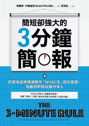 作者:布蘭特.平維迪克(Brant Pinvidic) 出版社:采實文化 出版日期:2021/03/25 語言:中文 ISBN:9789865073121 檔案格式:EPUB3-流式格式 閱讀裝置:閱讀器, Android應用程式, iOS應用程式 在分心的時代, 越重要的提案,越要「簡短」, 其實,最具有說服力的簡報, 只要3****分鐘! ★ Amazon.com讀者好評5顆星 ★ 好萊塢金牌導演兼製作人只花3****分鐘,讓害怕賠錢的投資人願意掏錢買單 ★ 《財富》百大企業執行長、家長會會長、修繕師傅、律師、業務等各界人士都推崇 ★ 好萊塢公認最優秀的創意銷售達人 ◎ 不是不專心,而是對資訊的要求更嚴格 根據微軟最新的研究指出,過去二十年,人類的平均注意力不斷縮短, 至今只持續8.2秒,連金魚都還有9秒, 但這不代表我們都是弱智、無腦又心不在焉, 反而是人們更專注也更有效率,對資訊的要求更嚴格。 ◎ 只花3分鐘,創下超過20億美元收入 好萊塢獲獎導演、金牌製作人布蘭特.平維迪克, 在3分鐘內,成功賣出超過三百部電視和電影企劃案, 總收入超過20億美元,創下了影視界傳奇。 於是,他獨創的「3分鐘簡報」,不只適用於好萊塢,更能運用在各行各業, 他也受邀擔任《財富》百大企業高階主管的教練及簡報顧問, 讓任何人都能打造只要3分鐘,就能吸睛而奏效的提案! ◎ 為什麼是3****分鐘? 研究指出,只要能讓消費者維持注意力3分鐘,最容易觸發購買動機: .一本書的前言,讀者還沒讀完前6頁,就會決定要不要繼續讀,大概不到3分鐘 .最引人入勝的電影宣傳片都不會超過3分鐘,超過1秒都不行 ◎ 說得少,效果卻最好的「WHAC****法」 平維迪克認為,企業、理念、產品或服務的價值,都必須在3分鐘內精準傳達, 最重要的關鍵是,以最吸引人的方式,提出最有價值的資訊, 確保觀眾能對內容感興趣、願意參與其中, 因此,他提出效果強大的「WHAC法」打造專屬故事── .「這是什麼?」(What is it?****): 是否說明了你的提議或要求?是你的工作,還是提供的服務? .「如何運作的?」(How does it work?****): 能否說明產品運作的方式,或你達成目標的方式? .「你確定嗎?」(Are you sure?****): 能否支持部分資訊的事實或數字?能證明什麼嗎? .「做得到嗎?」(Can you do it?****): 是否代表你能為觀眾執行或提供服務的能力? ◎ 拯救令人昏睡的簡報,讓投影片從殺手變幫手 多數人做簡報時,通常會迅速放上投影片,滔滔不絕講20分鐘, 容易滿口術語,也不在意資訊重不重要,反正盡量塞進觀眾腦中就好,但效果不彰。 然而,採用WHAC法後,可以達到實際成果── .讓開採油井公司「原油開採成本低」的優勢一目了然,成功贏得投資者的資助 .在一小時內,把生技藥廠39張投影片濃縮成一張,不說複雜醫學術語,讓人人都聽懂 .把水管公司雜亂資訊重新組合,讓觀眾「換水管一點也不麻煩」的結果 本書還有提供各種實際的案例,讓你能充分應用在生活的各個層面,並快速上手, 無論是學生、上班族、主管、行銷、顧問、業務、健身教練或承包商, 都能運用書中的指導原則,以最有效的方式將概念傳達出去,讓你說服所有人! 本書你將學到: .運用好萊塢必勝的敘事技巧,讓普通的提案,搖身成為極具效率又引人入勝的故事 .將資訊清楚的以條列式呈現,透過一項項解說,引導觀眾得出正確的結論 .將前三分鐘打造成簡報中,最有感染力的時間,讓你有機會繼續維持觀眾的注意力 .將元素編織成有趣的故事,達成說得少,但效果更好的目的